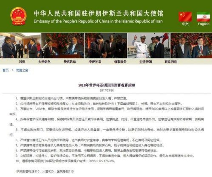 خبرگزاری صدا و سیما، سفارت جمهوری خلق چین در ایران با انتشار دستورالعملی از طرفداران این کشور خواست در دیدار امروز دو تیم در ورزشگاه آزادی حاضر شوند و نکات عنوان شده را رعایت نمایند. در این دستورالعمل نکاتی مانند رعایت حجاب اسلامی و احترام به رسوم ایرانیان ذکر شده است.