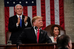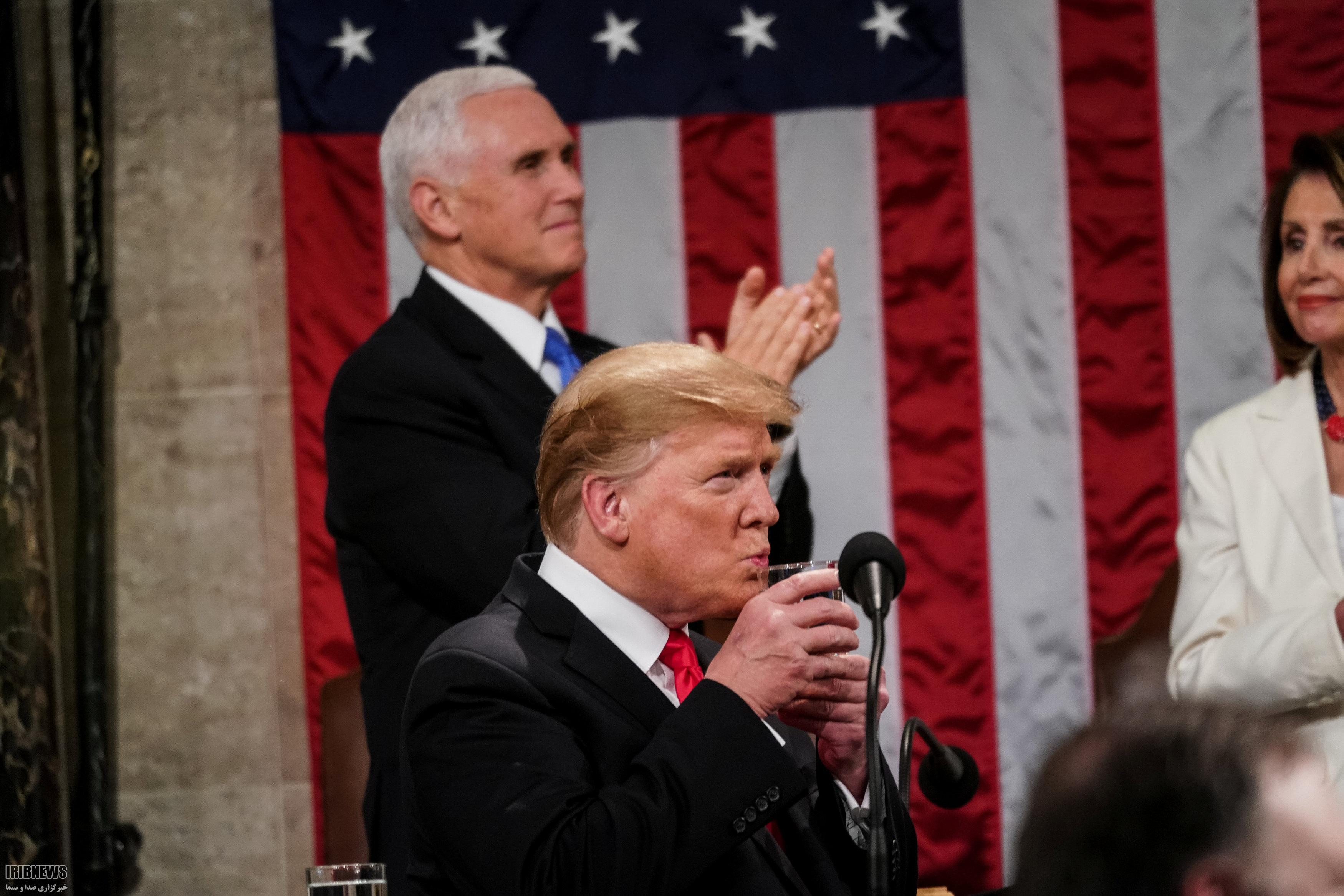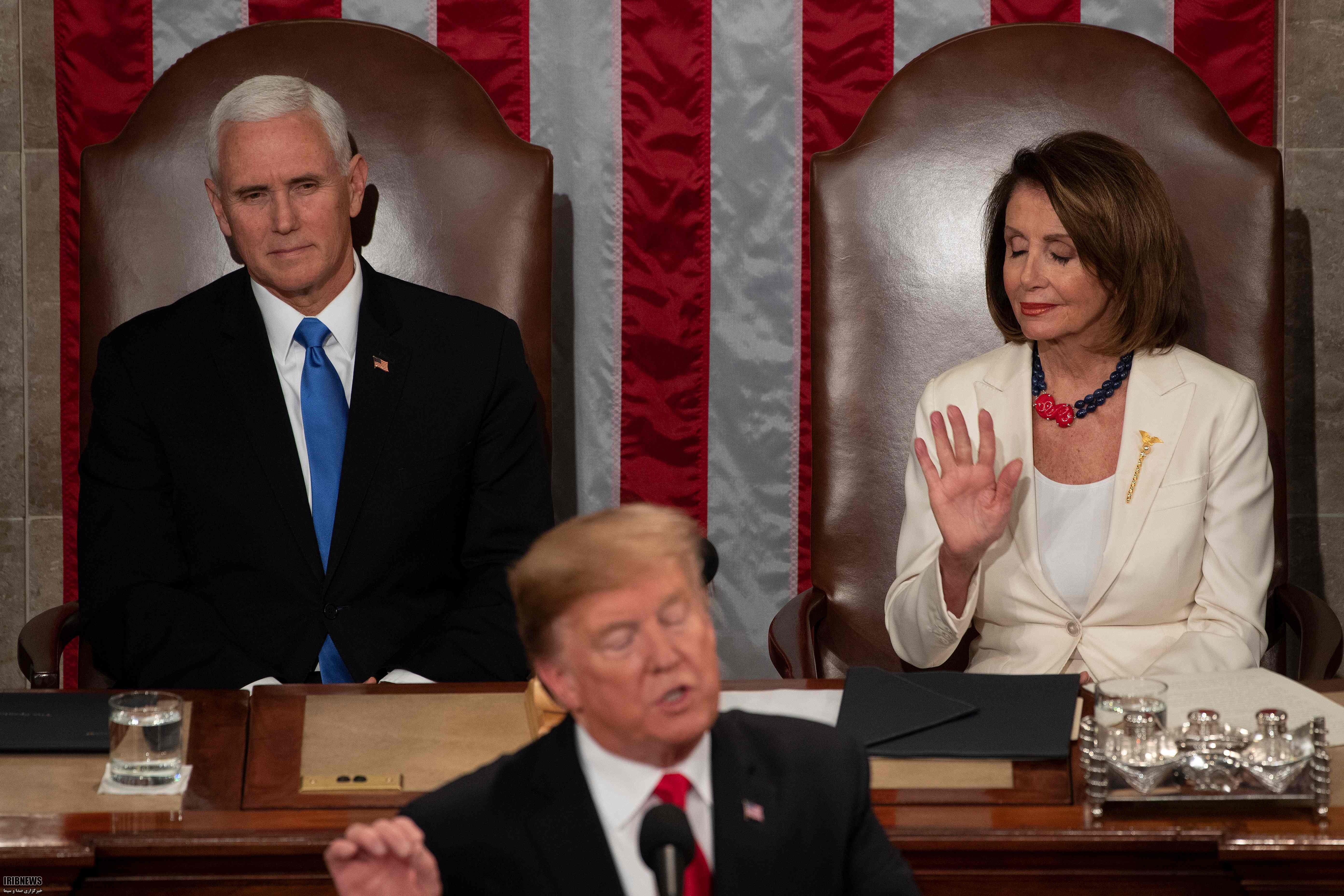 در حالی که مایک پنس معاون رئیس جمهور آمریکا، بارها در زمان سخنرانی ترامپ از جای خود بلند شد و برای ترامپ دست زد، اما نانسی پلوسی رئیس مجلس نمایندگان در کنار او نشسته بود، از بلند شدن و دست زدن برای ترامپ خودداری کرد و با توجهی به سخنان ترامپ، سرگرم مرتب کردن کاغذهای جلوی خود بود.
